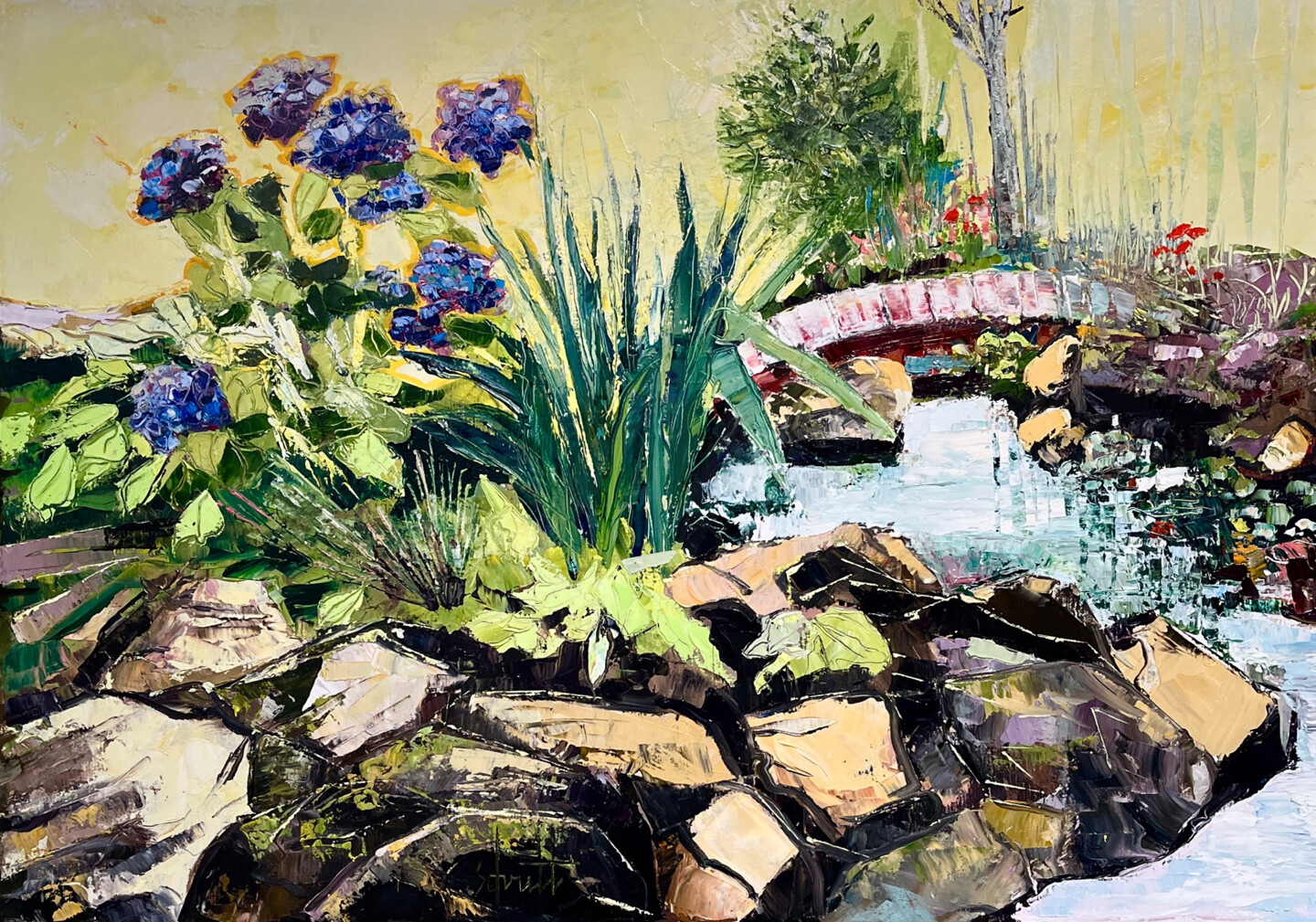 J'ai apporté une touche forte avec les grosses pierres qui bordent l'eau. Leur traitement en grands à-plats larges traduit l'énergie et le calme. Ils forment un contrepoint aux hortensias bordés de lumière qui sont des rayons de vie colorée et douce. Chaque coup de spatule à l'huile traduit l'émotion forte, épaisse et simple qui nait de la contemplation.