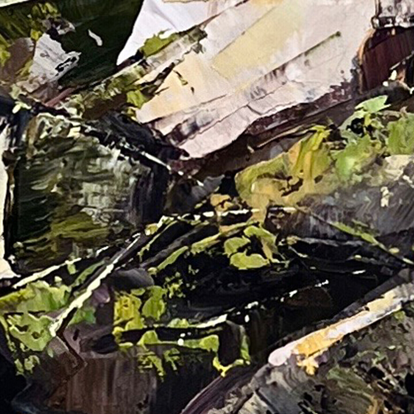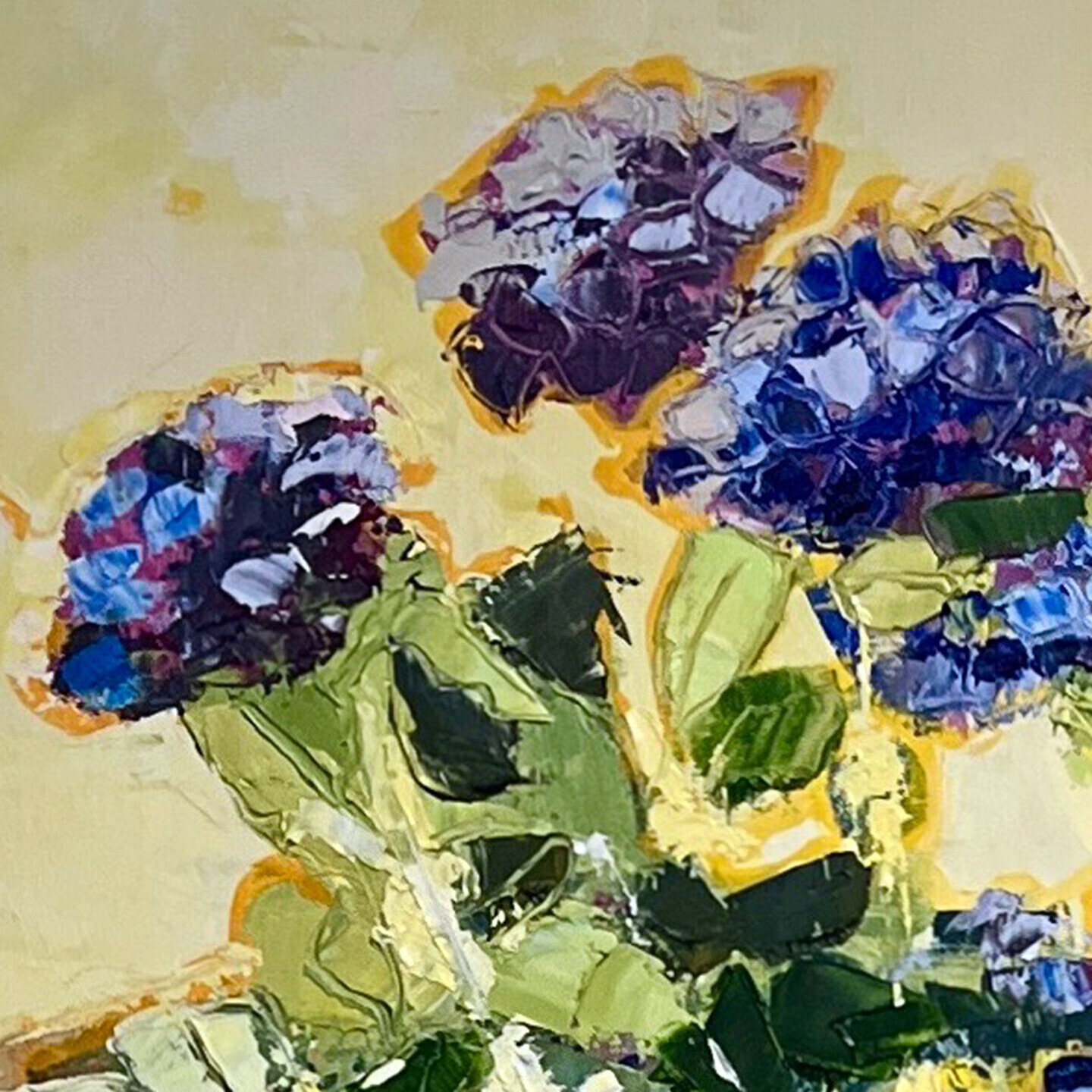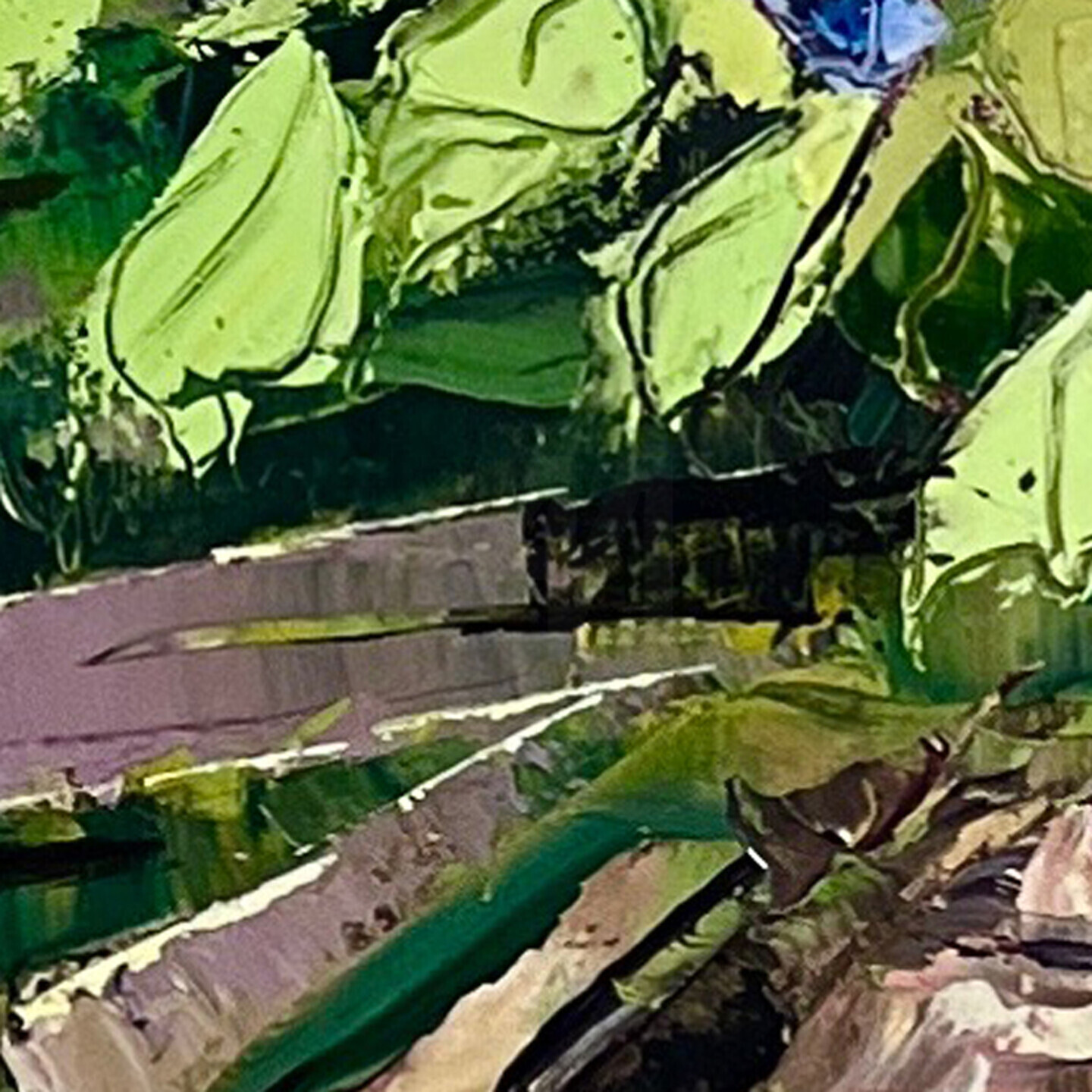 J'ai apporté une touche forte avec les grosses pierres qui bordent l'eau. Leur traitement en grands à-plats larges traduit l'énergie et le calme. Ils forment un contrepoint aux hortensias bordés de lumière qui sont des rayons de vie colorée et douce. Chaque coup de spatule à l'huile traduit l'émotion forte, épaisse et simple qui nait de la contemplation.